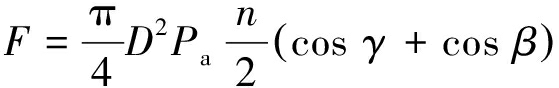 式中:D为立柱缸体内径,mm;Pa为立柱内部乳化液的压强,泵站额定压力为31.5 MPa,考虑到压力损失,这里取28.4 MPa;n为设备的立柱数;γ,β分别为前后两立柱的倾角,由于本设备立柱与顶梁是垂直布置,所以,角度都为0。