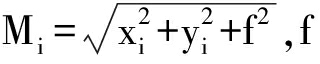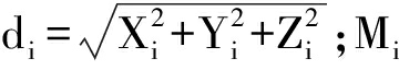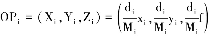 式中:(xi,yi)为Ci点的坐标;di为相机的光心Oc点到Pi点的距离,