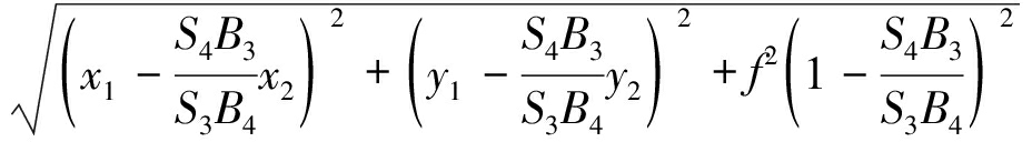 式中:S1为ΔP1P2P3的面积;S2为ΔP1P2P4的面积;S3为ΔP1P3P4的面积;S4为ΔP2P3P4的面积;h为相机光心到Pi点(i=1,2,3,4)构成平面的距离。