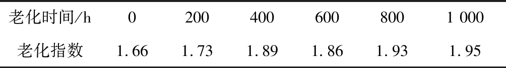 结合表1和表2可看出,随着老化时间的增加,老化指数整体呈增大趋势,表明电缆试样绝缘老化程度逐渐加深;老化200 h后,老化指数为1.73,表明电缆试样绝缘良好;老化400 h后,老化指数为1.89,表明电缆试样绝缘处于中度老化状态;老化800 h后,老化指数达1.93,表明电缆试样绝缘已经处于重度老化状态。