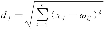步骤3:用式(1)计算输入样本与输出节点j之间的欧几里得距离,选择欧几里得距离最小的节点j*。