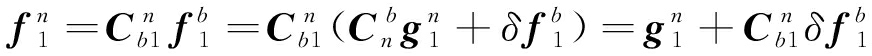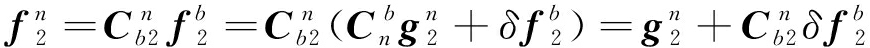 式中:fb为加速度计实时测量出来的加速度值;Cbn为导航坐标系(n系)到载体坐标系(b系)的坐标转换矩阵;gn为当地重力加速度在导航坐标系下的分量。