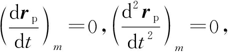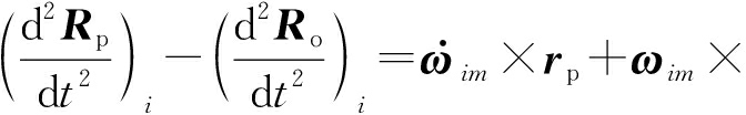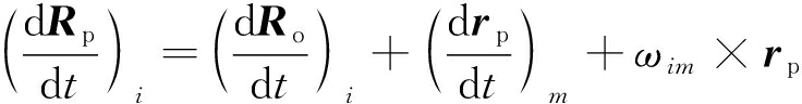 为了详细阐述捷联惯导中杆臂效应误差产生的原因,引入惯性坐标系OiXiYiZi和采煤机机体坐标系OmXmYmZm,ωim为机体坐标系相对惯性空间的转动角速度[11]。设定Om为防爆箱的中心,也是整个定位系统的摇摆运动中心,捷联惯导安装在防爆箱坐标系的固定点P点,Ro为防爆箱坐标系的原点位置矢量,Rp为P点相对于惯性坐标系的位置矢量,rp为P点相对于采煤机机体坐标系原点的位置矢量,即杆臂长度[12-13]。由矢量关系可得
