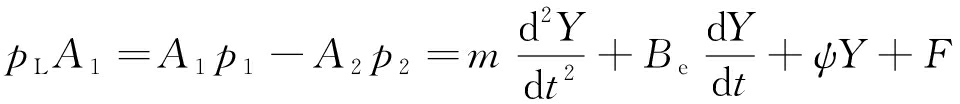 式中:pL为液压系统的实际压力;A1、A2分别为有杆腔和无杆腔的有效作用面积;m为负载与活塞杆的等效总质量;Y为活塞杆位移;Be为液压缸的黏性摩擦因数;ψ为负载弹簧刚度;F为作用在液压杆上的外载荷力。