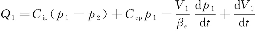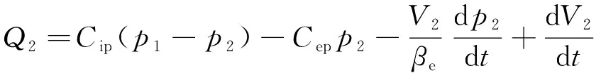 式中:Q1为液压缸有杆腔流量;Cip为液压缸内部泄漏系数;p1为液压缸有杆腔压力;p2为液压缸无杆腔压力;Cep为液压缸外部泄漏系数;V1为有杆腔有效容积;βe为系统有效体积弹性模量;t为时间;Q2为液压缸无杆腔流量;V2为无杆腔有效容积。