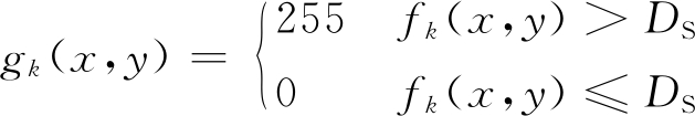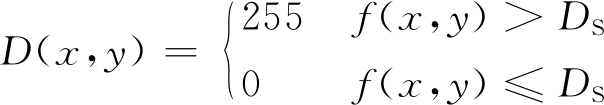 矿井突水时,会产生大量水花,水花图像灰度高于煤岩等背景图像。因此,可以通过设定阈值,将突水区域分割出来,阈值可以人为设定,也可以自适应产生。阈值分割如式(2)所示,DS为阈值,当图像像素点f(x,y)的灰度值大于DS时,对应像素点设置为255,否则设置为0,最终呈现二值图像。