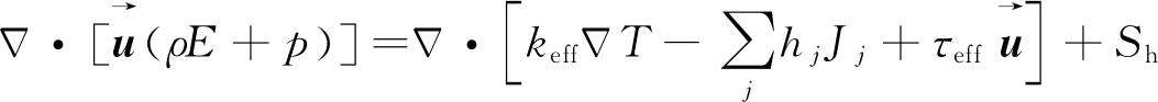式中:E为流体微团总能(内能、动能和势能之和),J/kg;keff为有效热传导系数,W/(m·K);T为流体微元体温度,K;hj为组分j的焓,J/kg;Jj为组分j的扩散通量;τeff为因分子能量扩散产生的作用于微元体表面的黏性应力分量,Pa;Sh为体积热源项,包括化学反应热源项及用户定义热源项。