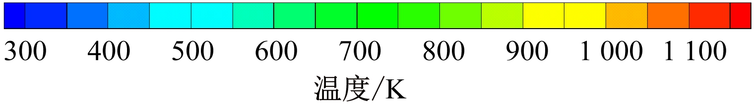 爆炸反应充分(t=0.5 s)时,沿z方向以0.2 m为步长对水平管道做截面切片,得到不同截面火焰温度云图,如图9所示。分析可知在z=0.2 m处截面上,距圆心越近则温度越低(最低约为400 K),距圆心越远则温度越高(最高约为900 K),说明该区域虽为爆源,但不是爆炸热量释放核心区。该截面上出现温度分布差异主要受高温核心区z=0.56~0.86 m范围影响,具体原因:煤尘在z=0.1~0.3 m高温点火区受热,随之析出水分、挥发分,并使挥发分气体与煤尘颗粒温度迅速上升,褐煤最低着火温度为800~1 000 K,在达到该温度前,受初始扬尘压力作用,褐煤尘云已沿z正方向发生运移并离开高温点火区(z=0.1~0.3 m),当运动至z=0.3~0.56 m时,爆炸反应持续进行,温度迅速跃升,到z=0.56~0.86 m时达到最猛烈爆炸状态,温度升高到极限。
