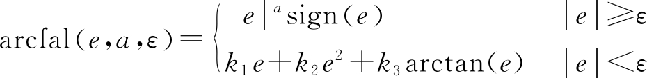 对非线性函数进行改进,使函数曲线更加平滑。改进后的函数命名为arcfal(),在变量|e|<ε范围内,函数arcfal(e,a,ε)仍然记为|e|asign(e)。在|e|<ε范围内,改进函数为e的幂函数和反正切函数形式的叠加,反正切函数使非线性函数在原点处有更好的平滑性,幂函数加快了非线性函数的收敛速度,即在|e|<ε时,有式(5)成立。
