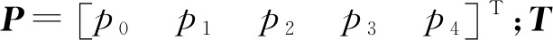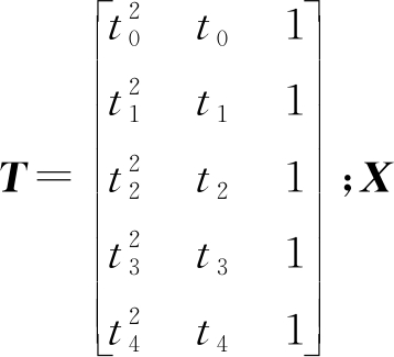 设待拟合的二次多项式为f(t)=at2+bt+c,其中f(t)为位置坐标,t为时间;a,b,c分别表示二次多项式的二次项系数、一次项系数及常数项。选取标签运动过程中当前时刻之前5个点(t0,p0)、(t1,p1)、(t2,p2)、(t3,p3)、(t4,p4)为曲线拟合数据,其中ti与pi分别为第i次计算得到的时间与位置,其矩阵形式为