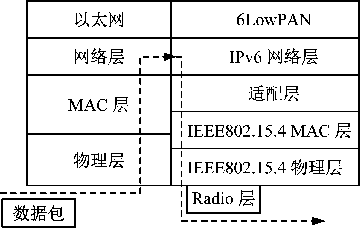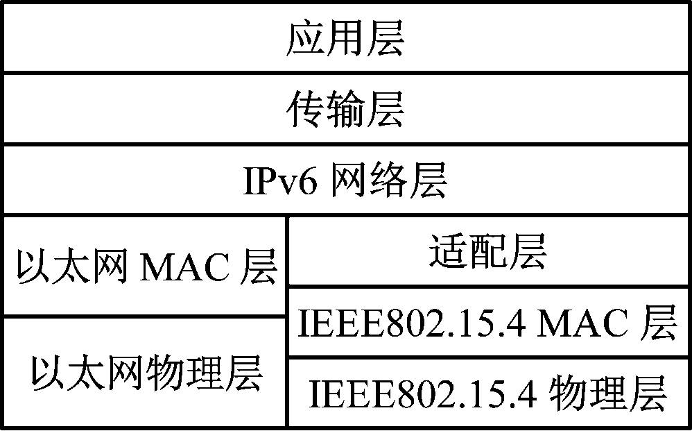 以太网IP协议(左)与6LowPAN的uIP协议(右)的分层结构如图6所示,两者在IPv6网络层进行数据交换。因IEEE 802.15.4标准仅针对MAC层和物理层进行标准制定,未对逻辑上层进行标准化,所以,IEEE 802.15.4无法为IPv6提供接口服务。为实现IPv6与IEEE 802.15.4标准之间的融合,6LowPAN在两者之间提供了一个适配层对链路接口进行封装,继而为IPv6提供标准接口。适配层提供分片重组、报头压缩、网络路由等功能,使得6LowPAN能够进行基于IPv6的通信[14]。