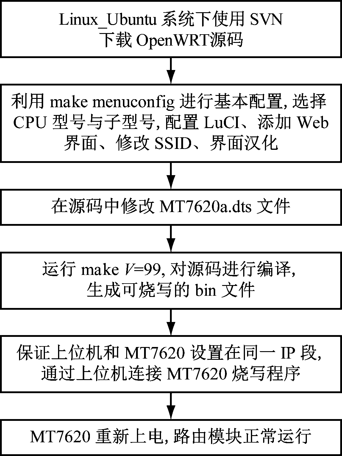 边界路由采用OpenWRT系统设计,该系统是一款基于Linux内核的高度模块化和自动化的路由系统,拥有极强的网络组建性和可扩展性[8]。将OpenWRT系统移植到MT7620上,可利用UDP协议向数据汇聚节点分配IP地址。当网络出现异常时,路由系统会通过DHCP协议再次接入网络,从而保证6LowPAN系统可永久接入井下环网,继而保证整个传输系统的稳定性和可靠性。OpenWRT移植过程如图3所示。