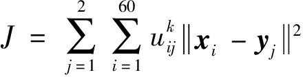 设X=[x1,x2,…,x60]为气煤-泥岩、气煤-粉砂岩、气煤-泥质灰岩3种组合中1个分组的煤岩特征光谱矩阵,则类别数为2,yj(j=1,2)为每次迭代开始时2个类别的聚类中心,uij(i=1,2,…,60)为每次迭代时第i个特征光谱样本xi属于第j类的所得隶属度,聚类损失值为[22]