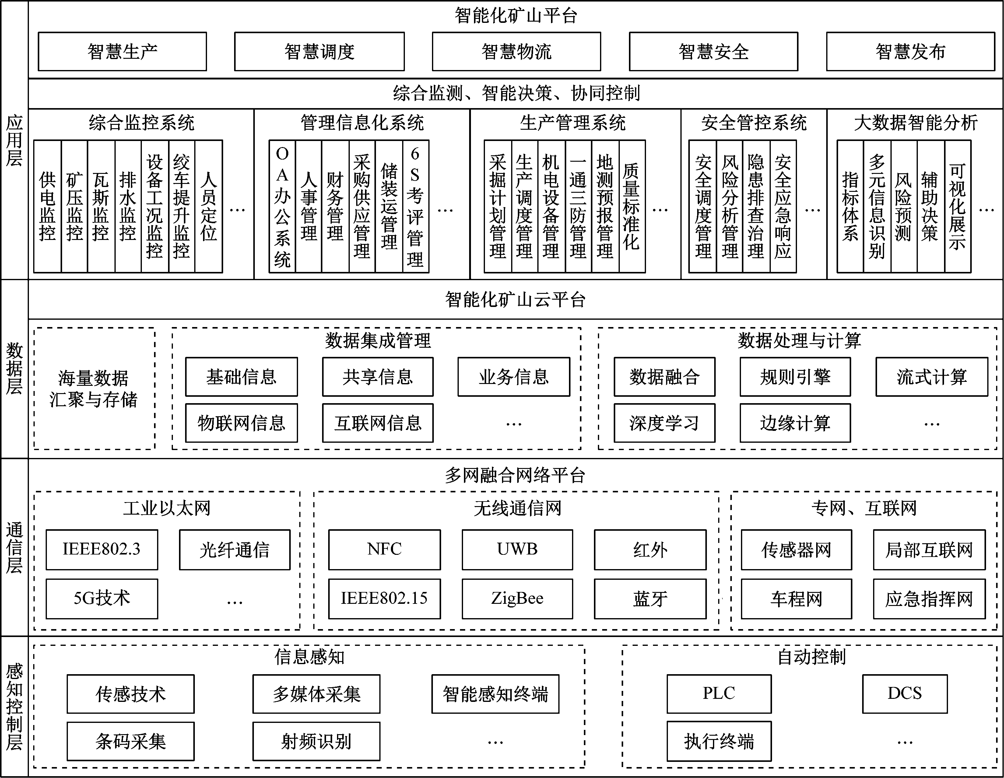 (3) 智能化矿山建设涉及多源传感器体系搭建、井下复杂条件信息传输、智能化矿山云平台开发、安全生产系统构建、矿井设备智能联动控制、矿井智能应急处置等多项关键技术。
