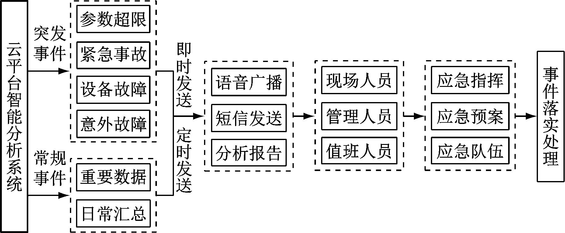 针对生产过程中所发生的事故或灾害,智能化矿山必须具备相应的应急处置能力。云平台智能分析系统获悉事件后,将以语音广播、短信、分析报告等形式发送给现场人员、管理人员、值班人员,从而进行应急指挥,安排应急队伍执行应急预案,以便及时妥善地处理各类事件。其中,参数超限、紧急事故、设备故障、意外故障等突发事件采取即时发送方式;重要数据、日常汇总等常规事件采用定时发送方式。智能化矿山应急处置流程如图4所示。