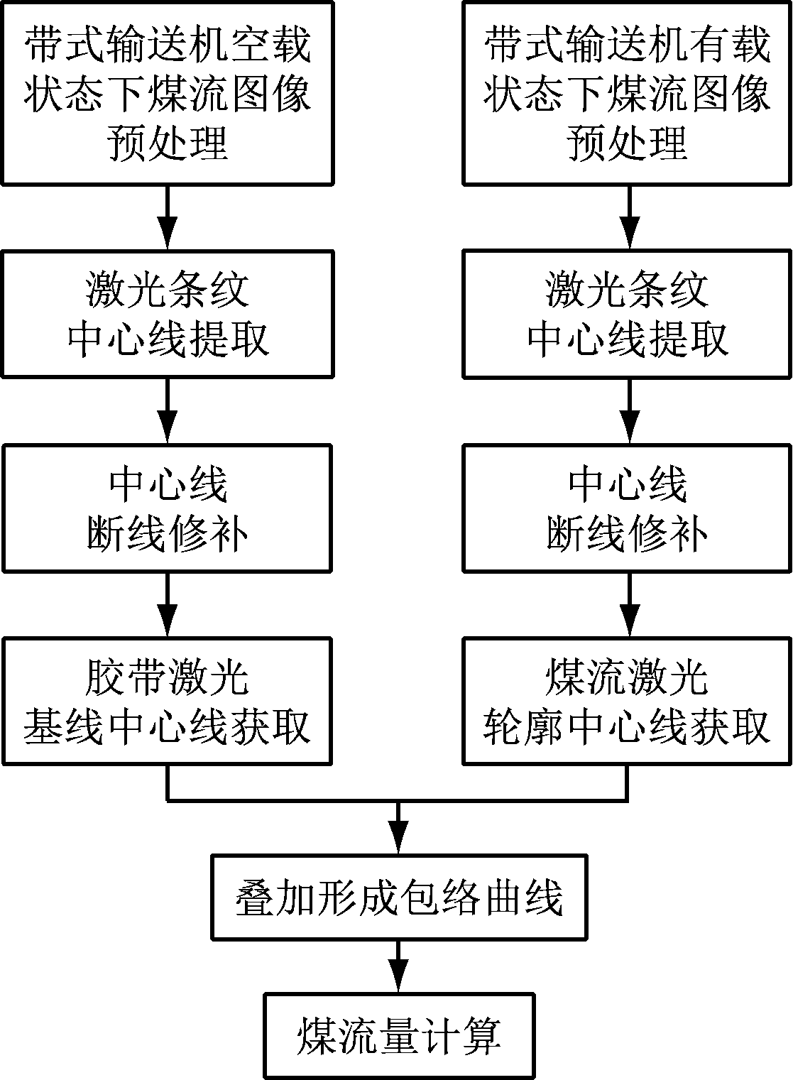 煤流量检测流程如图3所示。地面控制中心信息处理平台分别对带式输送机空载和有载情况下的煤流图像进行预处理,提取图像中激光条纹中心线并补全残缺的线条。将带式输送机空载状态下胶带激光基线中心线和带式输送机有载状态下煤流激光轮廓中心线进行叠加,形成封闭的包络曲线,计算该曲线所围成截面内瞬时煤流量。