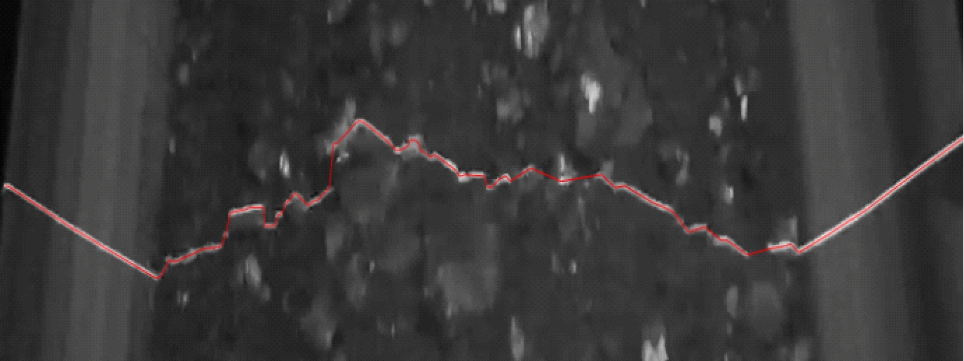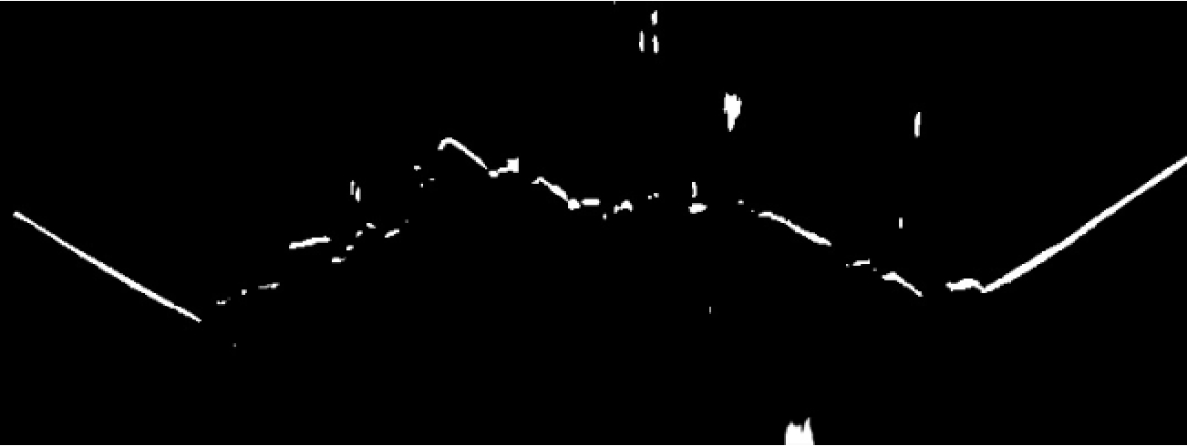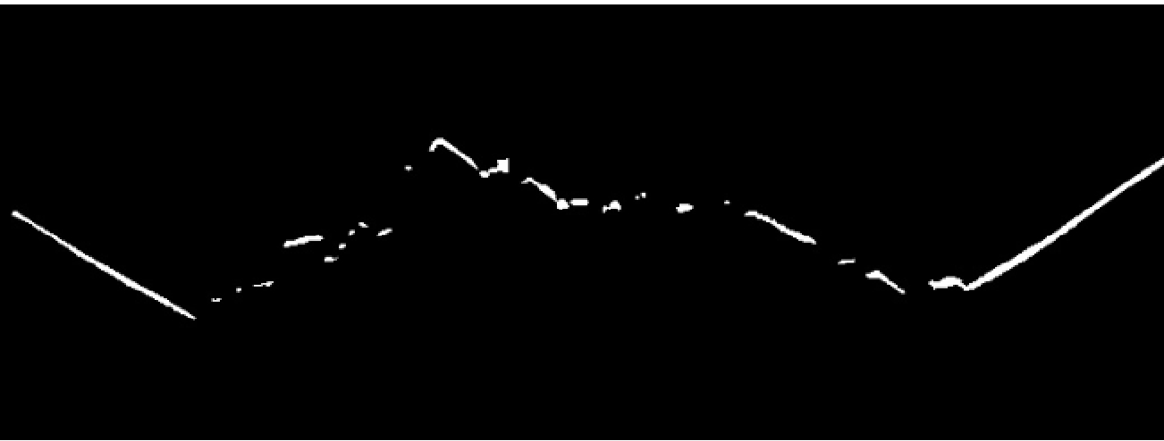 由于煤炭在环境光的照射下会产生局部反光的现象,在胶带运动状态下煤炭反光部分多呈点状或竖直条状高亮光斑,所以阈值分割后保留了绝大部分水平分布的激光条纹图案和较少部分的高亮光斑噪声。利用OpenCV计算机视觉库中的FindContours函数对阈值分割后的二值图像查找所有轮廓并绘制轮廓外接矩形[9];根据光斑噪声的特点,采用基于轮廓外接矩形的长宽比、面积、位置的多特征联合去除异常高亮光斑噪声(图4(c)),较好地保留了激光条纹图案。
