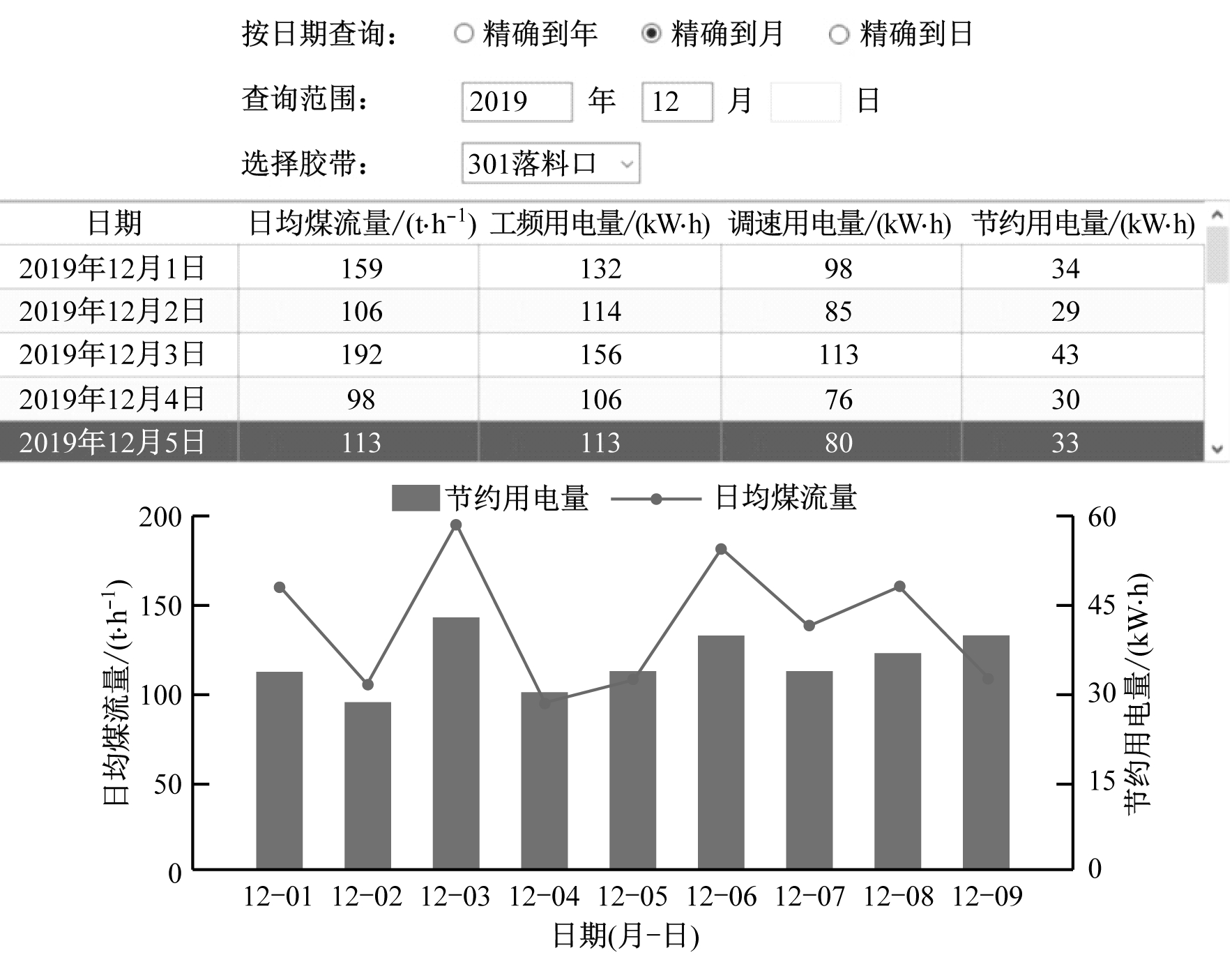 利用数据库将带式输送机煤流量及用电量等数据按照用户需要进行分类和归档。同时为方便用户查看,将归档数据以报表和趋势曲线的形式进行展示(图11),可直观反映带式输送机相关数据随时间变化规律,有利于用户制定科学的生产计划。