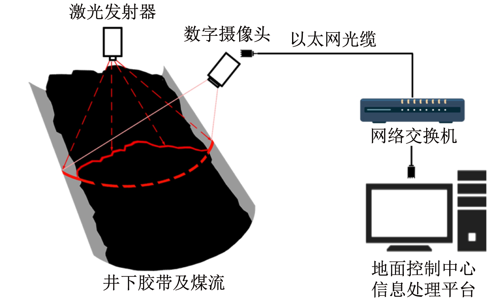 基于机器视觉的带式输送机煤流量检测布置如图2所示。在带式输送机正上方相隔一定距离安装激光发射器和数字摄像头。激光发射器发射的激光投射在煤流表面形成的激光条纹与胶带水平轴线垂直,数字摄像头倾斜一定角度以采集设定区域内包含激光条纹的煤流图像,并通过以太网光缆经网络交换机将图像数据上传至地面控制中心信息处理平台。