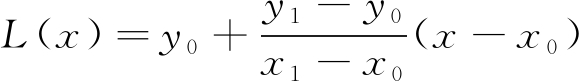 摄像头在倾斜姿态下受煤流遮挡导致采集的煤流图像中部分激光条纹缺失,利用方向模板法提取激光条纹中心线时会对距离较近的断线进行修补,但仍有部分断线存在于激光条纹图像中。常见的断线修补方法有线性插值法和三次B样条差值法等,为进一步提升煤流量检测速度,本文选用线性插值法进行激光条纹中心线的断线修补,即利用相邻的2个断点(x0,y0)和(x1,y1)之间的直线L(x)来近似拟合丢失的激光条纹中心线[15]: