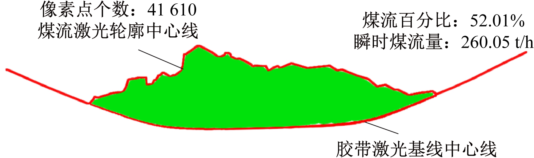 计算某时刻带式输送机空载状态下胶带激光基线中心线和带式输送机有载状态下煤流激光轮廓中心线叠加形成的封闭包络曲线内像素点个数与带式输送机空载状态下胶带激光基线中心线和带式输送机额定载荷状态下煤流激光轮廓中心线叠加形成的封闭包络曲线内像素点个数的比值,得到煤流百分比P,则该时刻下瞬时煤流量为