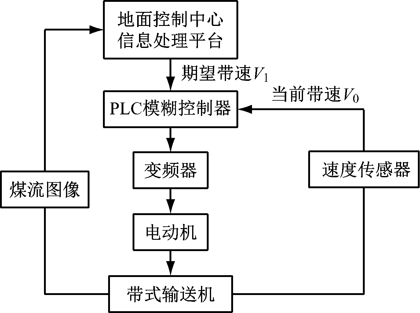 为实现带式输送机节能运行,需要根据煤流量实时调节带式输送机运行速度。带式输送机变频调速控制原理如图8所示。通过地面控制中心信息处理平台对现场煤流图像进行处理获得带式输送机当前煤流量[16],根据煤流量计算期望带速V1。PLC模糊控制器根据期望带速V1和速度传感器采集的当前带速V0控制变频器输出频率,从而调节电动机转速,实现带式输送机运行速度自动调节。