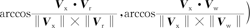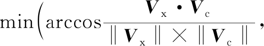 煤、岩、突涌水图像训练样本经时空泛化建模(本文选择0,45,90,135° 4个方向,6个感受野,即Nd=4,Nf=6)进行特征提取,得到长度为48的纹理特征向量(学习特征向量)。提取的待测样本特征向量(待测特征向量)需与学习特征向量进行比较,得出相似性。经Gabor分解后特征向量各个分量差异较大,若以距离作为相似性测度,则较大的分量对相似性的影响会导致其他分量的差异性被忽略。因此,笔者采用特征向量各分量之间的夹角作为图像的相似性测度。该夹角对特征向量的绝对值不敏感,更关注特征向量在方向上的差异性,避免了传统距离测度易受单一分量影响的问题。设Vc,Vr,Vw分别为提取的煤、岩、突涌水图像学习特征向量,Vx为待测特征向量,则矿井水灾识别问题可转换为求解下式。