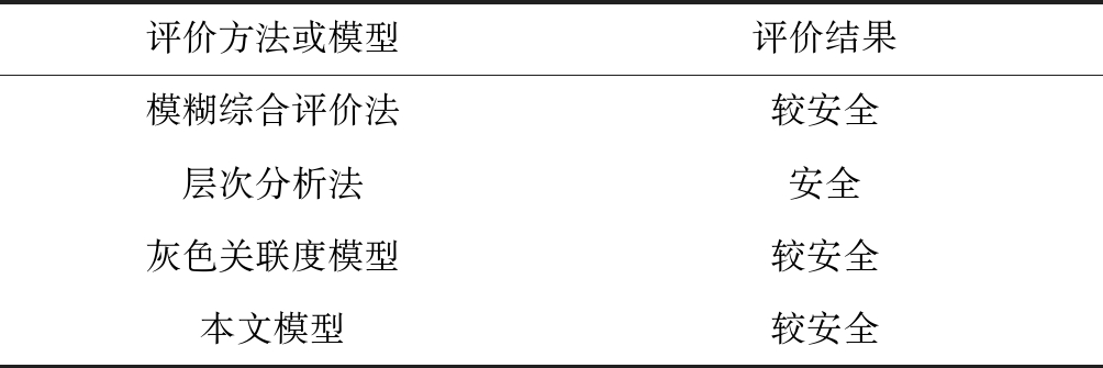 评价方法或模型评价结果模糊综合评价法较安全层次分析法安全灰色关联度模型较安全本文模型较安全