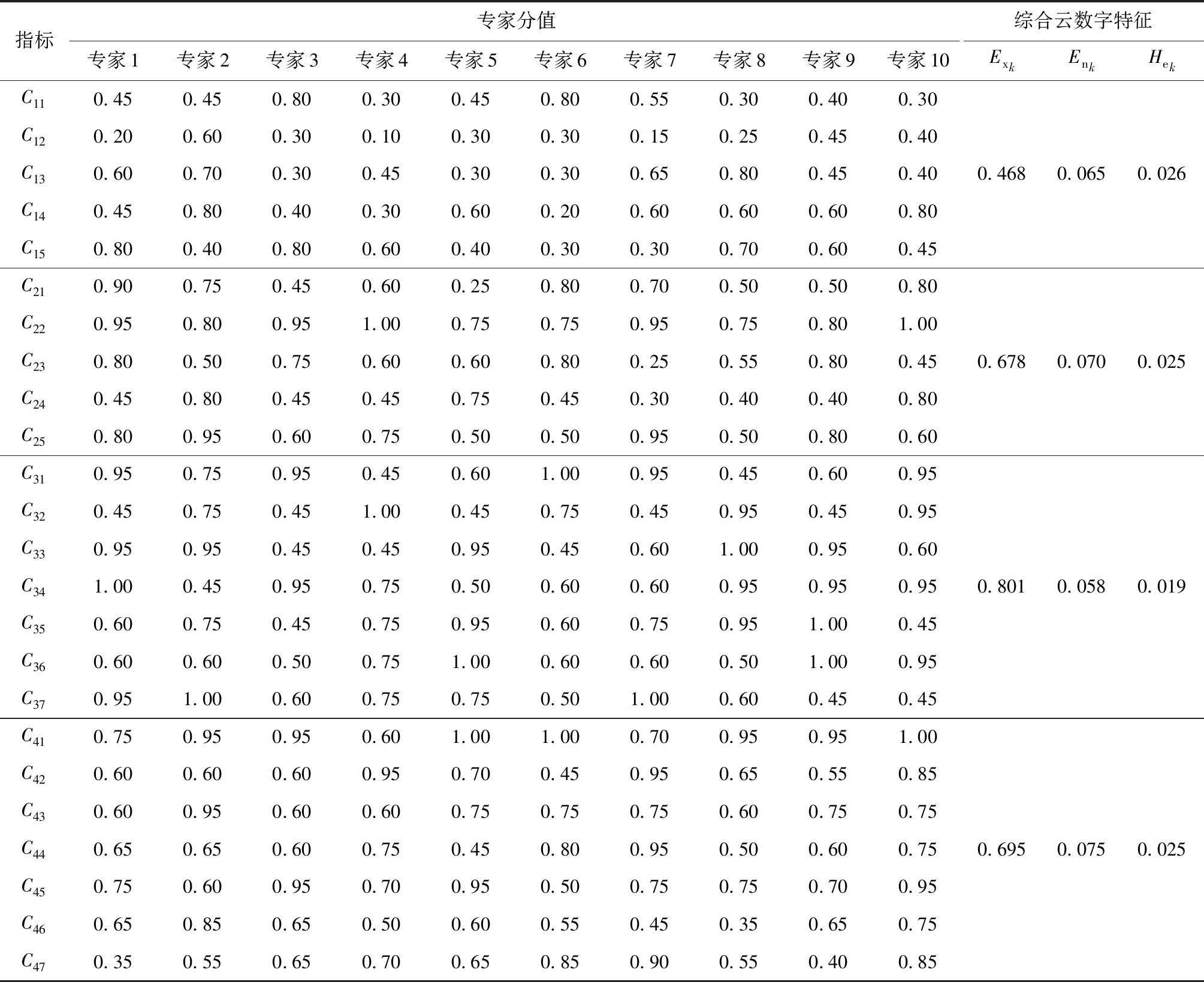 聘请10位专家对新兴煤矿煤与瓦斯突出指标进行定性评价,利用云模型正向云发生器获得指标数据,并将数据代入式(6)—式(11),得到二级指标的云数字特征,见表2。10位专家参考现场实际情况,凭借个人经验和水平,给出二级指标的权重,运用D-S证据理论的冲突证据合成方法,通过式(1)—式(5)对指标权重进行融合,获得指标的综合权重系数,见表3。