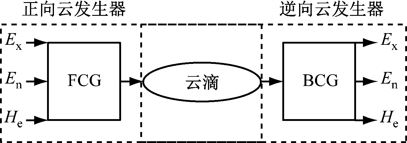 云发生器可处理定性概念与定量表征的相互关系。一维云发生器如图3所示。其中,正向云发生器(Forward Cloud Generator,FCG)处理由定性概念到定量表征的转换;逆向云发生器(Backward Cloud Generator,BCG)处理由定量表征到定性概念的转换。