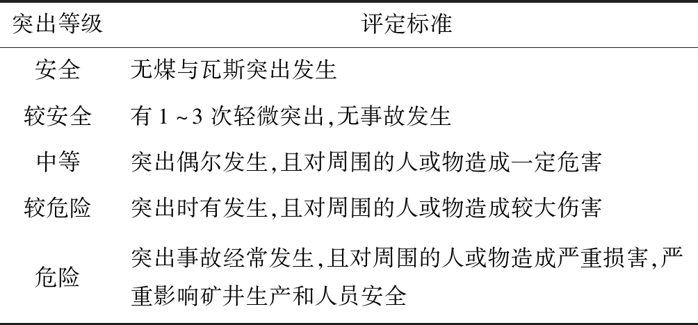 突出等级评定标准安全无煤与瓦斯突出发生较安全有1~3次轻微突出,无事故发生中等突出偶尔发生,且对周围的人或物造成一定危害较危险突出时有发生,且对周围的人或物造成较大伤害危险突出事故经常发生,且对周围的人或物造成严重损害,严重影响矿井生产和人员安全