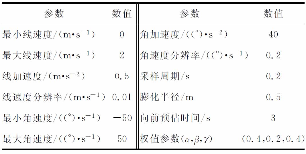 参数数值参数数值最小线速度/(m·s-1)0角加速度/((°)·s-2)40最大线速度/(m·s-1)2角速度分辨率/((°)·s-1)0.2线加速度/(m·s-2)0.5采样周期/s0.2线速度分辨率/(m·s-1)0.01膨化半径/m0.5最小角速度/((°)·s-1)-50向前预估时间/s3最大角速度/((°)·s-1)50权值参数(α,β,γ)(0.4,0.2,0.4)