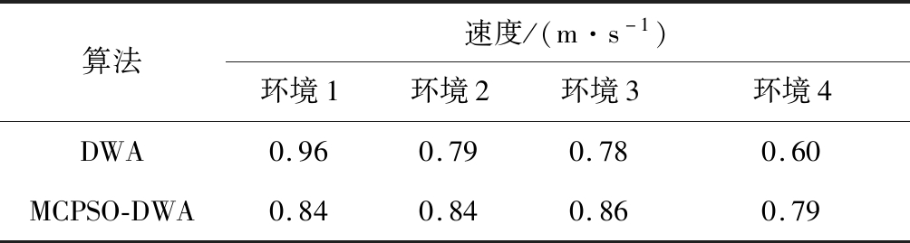 算法速度/(m·s-1)环境1环境2环境3环境4DWA0.960.790.780.60MCPSO-DWA0.840.840.860.79