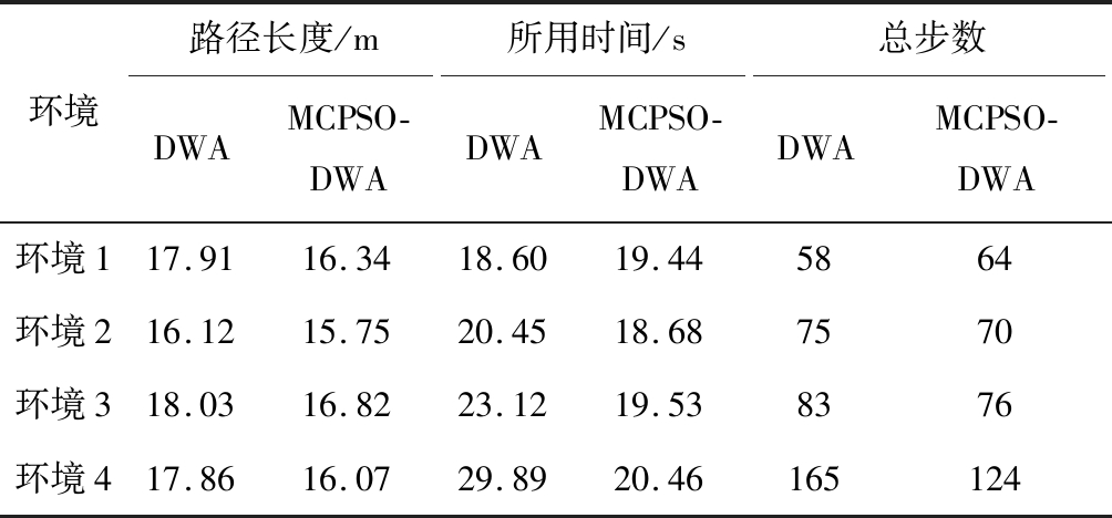表3给出了DWA和MCPSO-DWA在以上环境中规划路径的数据对比。从表3可看出,对于简单的环境1, MCPSO-DWA规划路径的时间和总步数虽然不占优势,但规划路径的长度比DWA要短8.77%;对于一般复杂度的环境2和环境3, MCPSO-DWA规划路径用时分别比DWA规划路径用时要少8.66%和15.53%,并且规划路径的长度也比DWA规划路径长度短2.30%和6.71%;对于复杂环境4, MCPSO-DWA相比DWA在总步数减少41步的情况下,规划时间减少31.55%,规划路径长度减少10.02%。