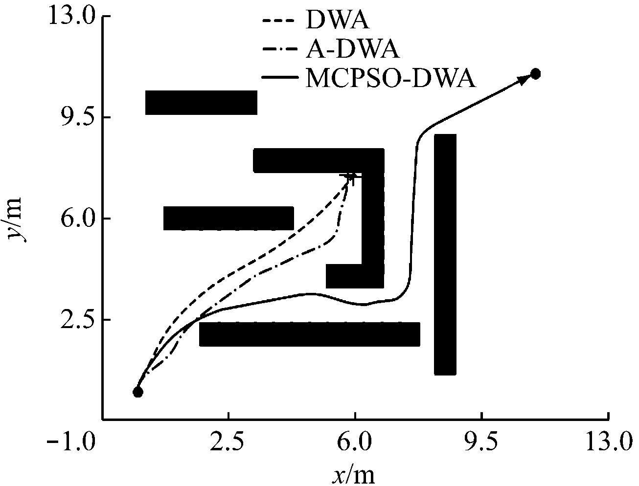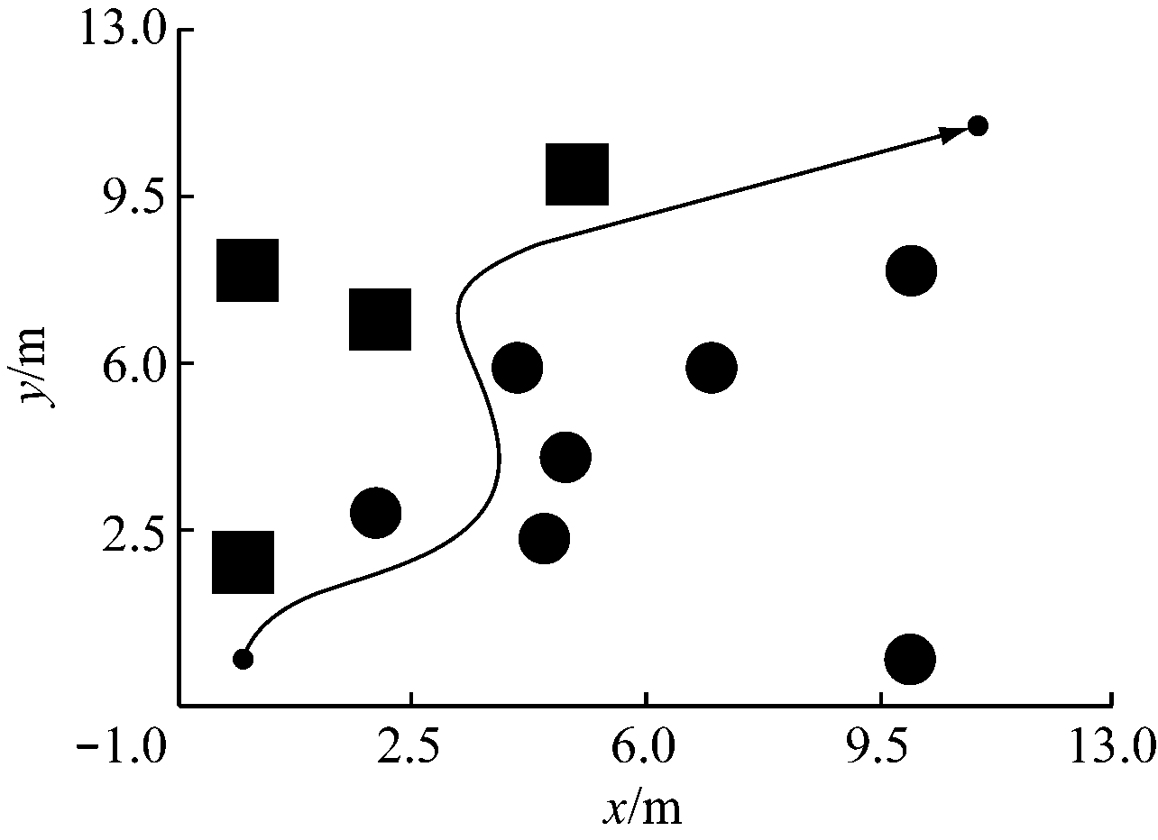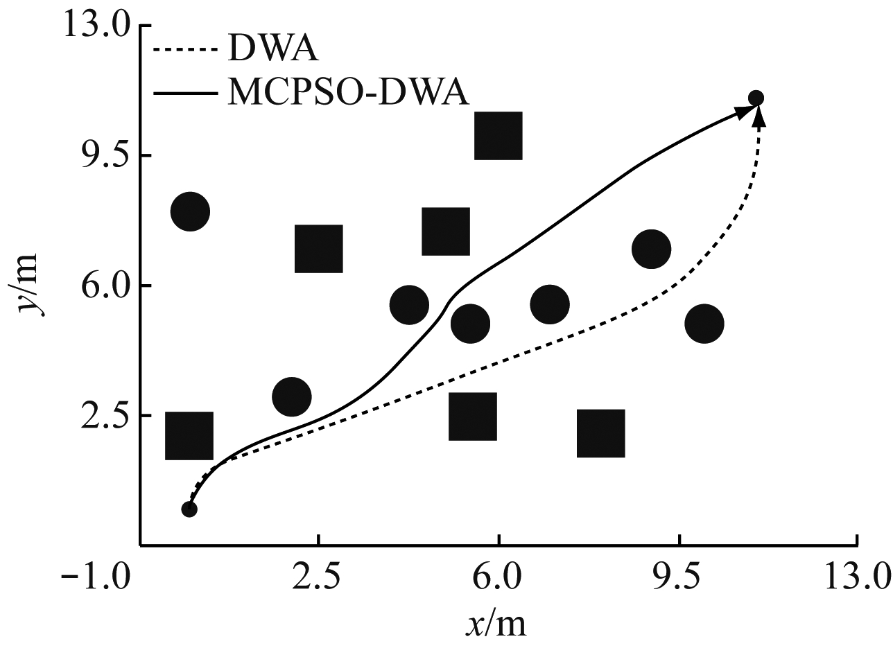 为验证MCPSO-DWA的有效性,分别在不同复杂度的环境中,对比MCPSO-DWA和DWA的性能,对煤矿移动机器人行驶的路程、时间和穿越密集障碍物的能力等进行比较和分析。