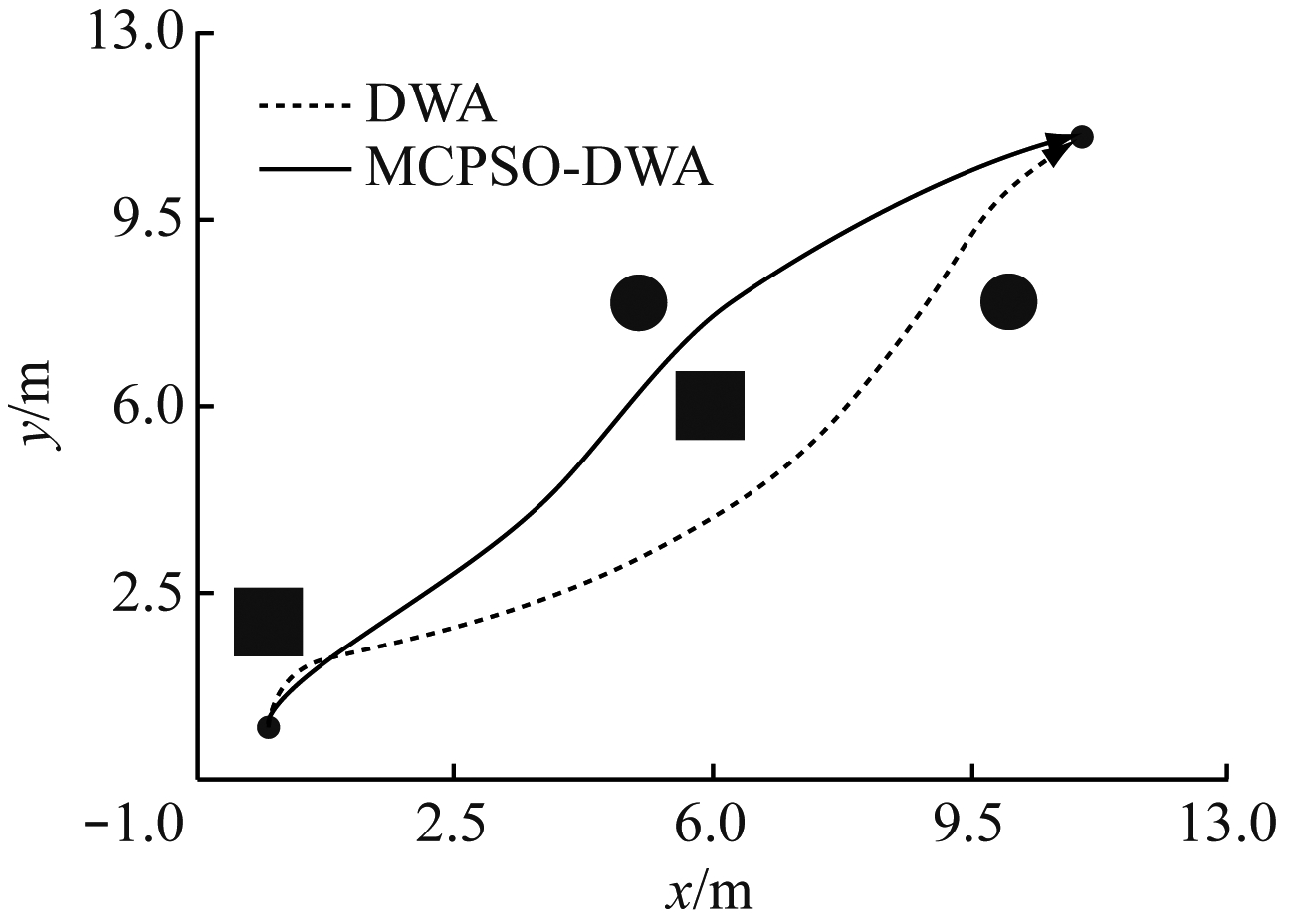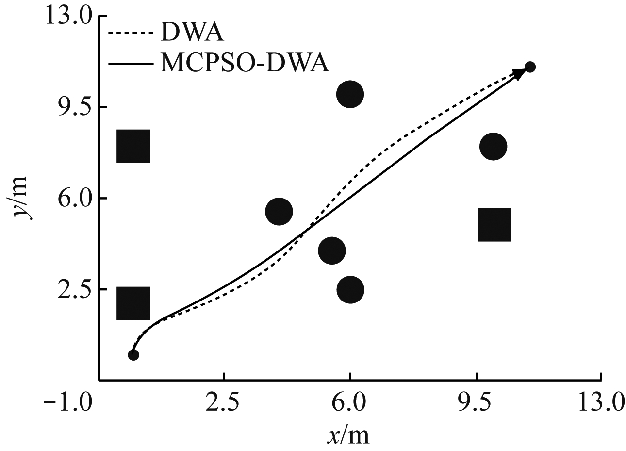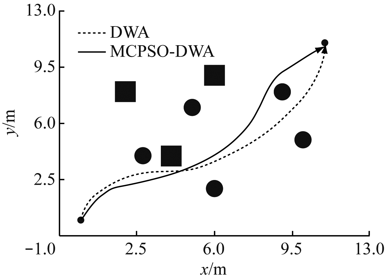 为验证MCPSO-DWA的有效性,分别在不同复杂度的环境中,对比MCPSO-DWA和DWA的性能,对煤矿移动机器人行驶的路程、时间和穿越密集障碍物的能力等进行比较和分析。