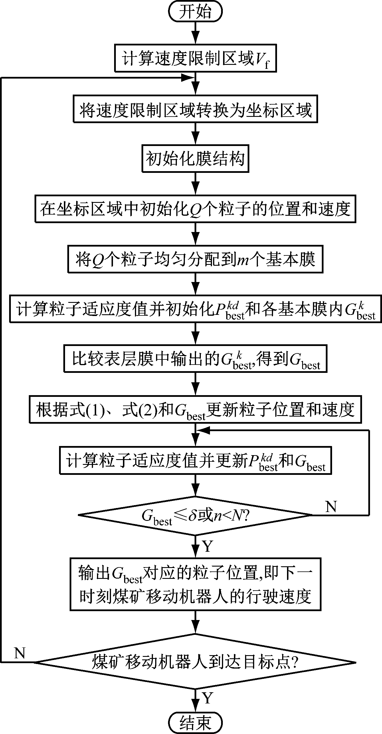 (8) 膜内种群不断迭代更新,直到达到最大迭代次数或者种群全局最优Gbest的适应度值达到δ,停止迭代,输出此时Gbest对应粒子的位置坐标,即煤矿移动机器人下一时刻行驶的避障速度,否则返回步骤(3)。