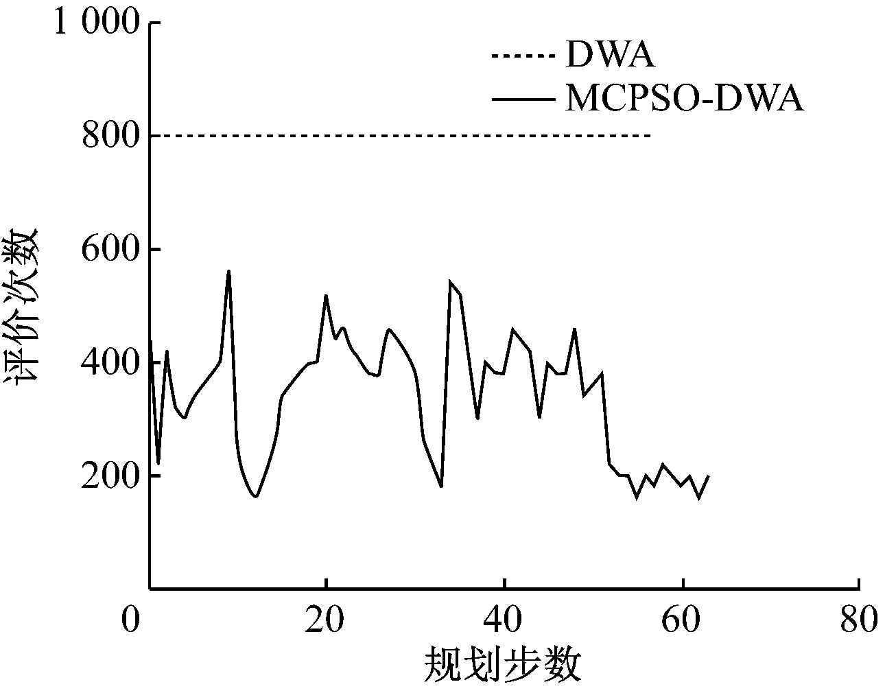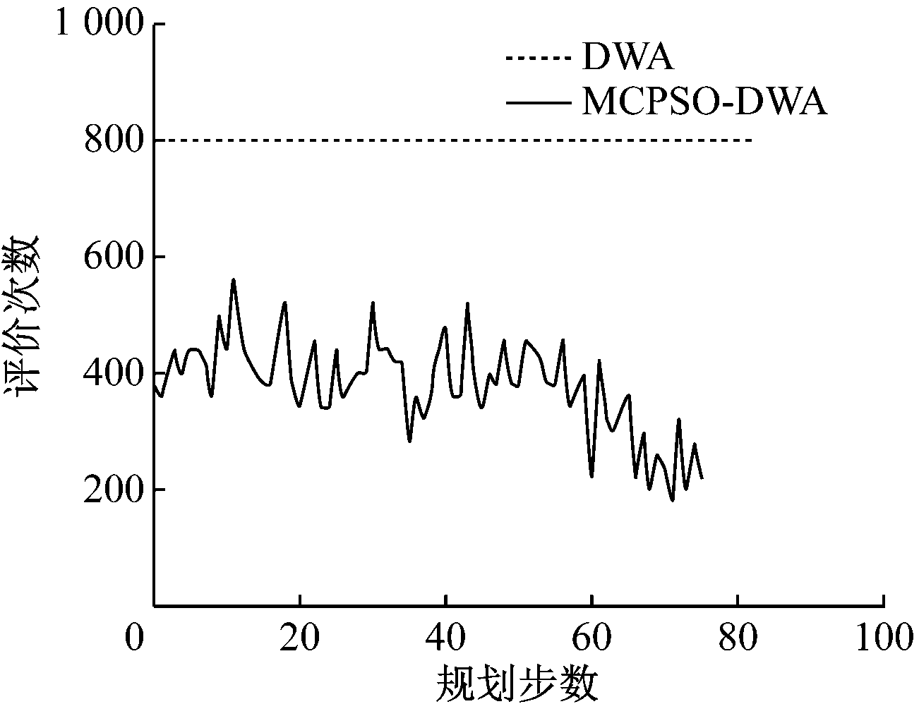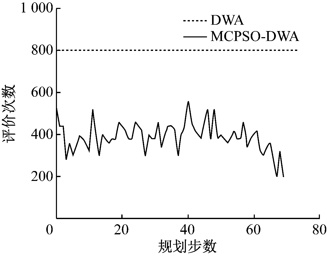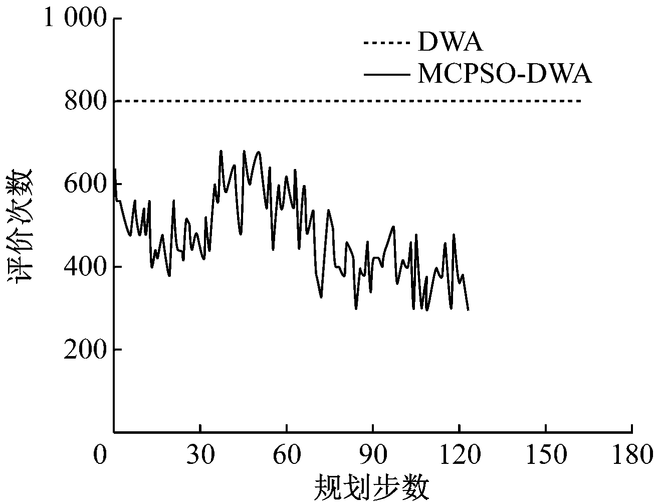 图6 MCPSO-DWA与DWA规划步数与评价次数对比