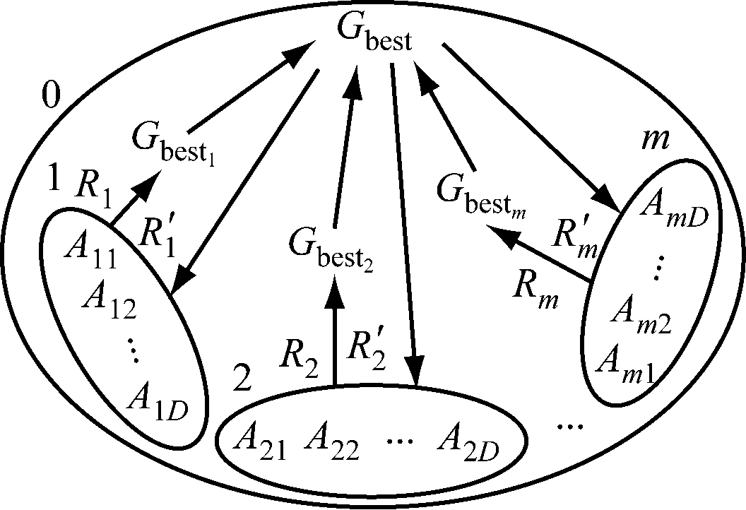 别为膜内输出和输入规则。对各基本膜内的粒子A进行第1次搜索,产生各基本膜内全局最优Gbest1,Gbest2,…,Gbestm,分别根据规则(R1,R2,…,Rm)将各基本膜内全局最优输出到表层膜中进行比较,产生系统的全局最优Gbest,将Gbest作为种群的全局最优并根据规则