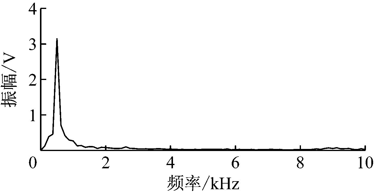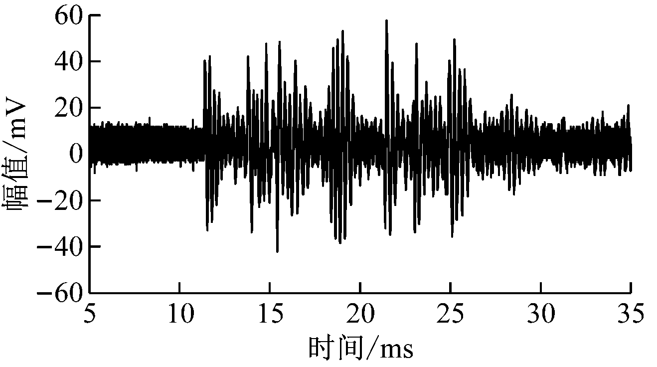 在实验室条件下,利用ASE宽带光源、隔离器、2×2耦合器、2×1耦合器、法拉第旋转镜和单模光纤搭建光纤声音传感子系统。延迟光纤由长度为4 km的G652D单模光纤缠绕而成,放置在2×2耦合器与2×1耦合器之间。10 km单模光纤用于模拟井下长距离光缆传输。将长度为6 m的G652D单模光纤缠绕成直径为10 cm的圆环,用圆环制作光纤探头;光纤探头接入光缆末端,光缆最尾部与法拉第旋转镜连接。采用隔音海绵对除光纤探头以外的系统装置进行隔音处理,在光纤探头附近施加敲击等声音信号,并通过光纤探头拾取。在实验过程中,ASE宽带光源采用12 V数字电源供电,向系统提供光功率为1 mW、中心波长为1 550 nm的探测光。当外界无声音信号时光电转换模块的输出信号如图3所示。由图3可知,系统本身噪声幅值约为10 mV。