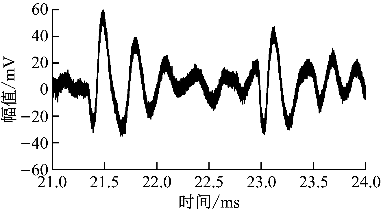 在相同实验条件下,用手指轻敲光纤探头,测得光电转换模块的输出信号,如图4(a)所示。由图4(a)可知,响应曲线的峰峰值为102.6 mV,光纤声音传感子系统对外界声音变化敏感,可实时反映外界声音变化。选取图4(a)中21~24 ms时间段的信号波形展开,如图4(b)所示。由图4(b)可知,光电转换模块输出的音频为交流电信号。