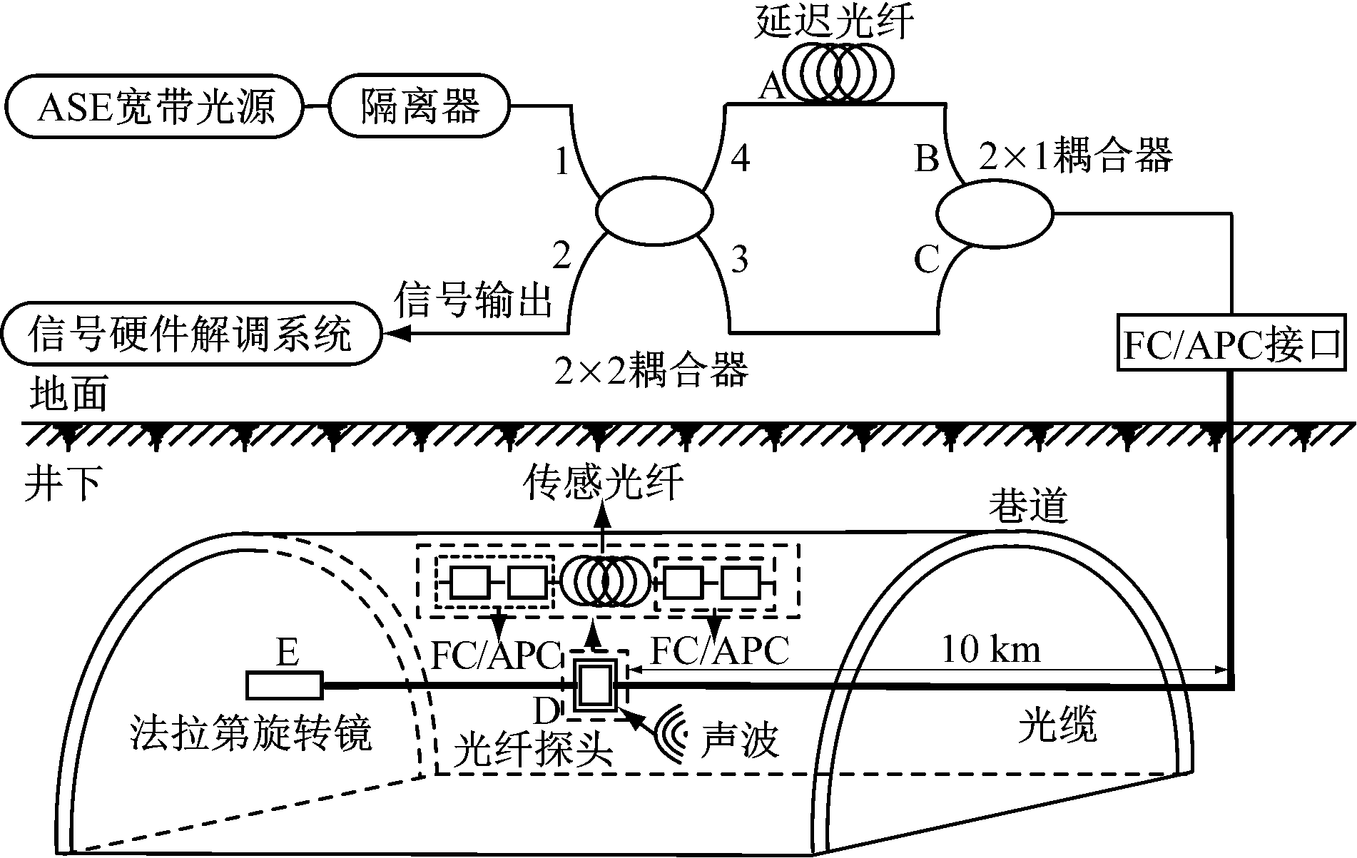 光纤具有本质安全、无源传输、抗干扰性强、灵敏度高、耐腐蚀、电绝缘、便于铺设、易工程化等优势[10-11],可摆脱电能束缚,在煤矿井下潮湿、地形多变、电磁干扰、易燃易爆的复杂环境中稳定工作[12-13]。因此,本文设计了一种煤矿光纤传感应急通信系统,实现了矿井灾后无电环境下对井下被困人员声音信息的采集、传输和处理。该系统包含光纤声音传感子系统与硬件解调子系统2个部分:在井下巷道铺设的光缆中加入光纤探头,构建光纤声音传感子系统,侦听巷道内被困人员呼喊、敲击等声音信号;硬件解调子系统放置于地面,用于提取并还原加载在光信号里的音频信息。