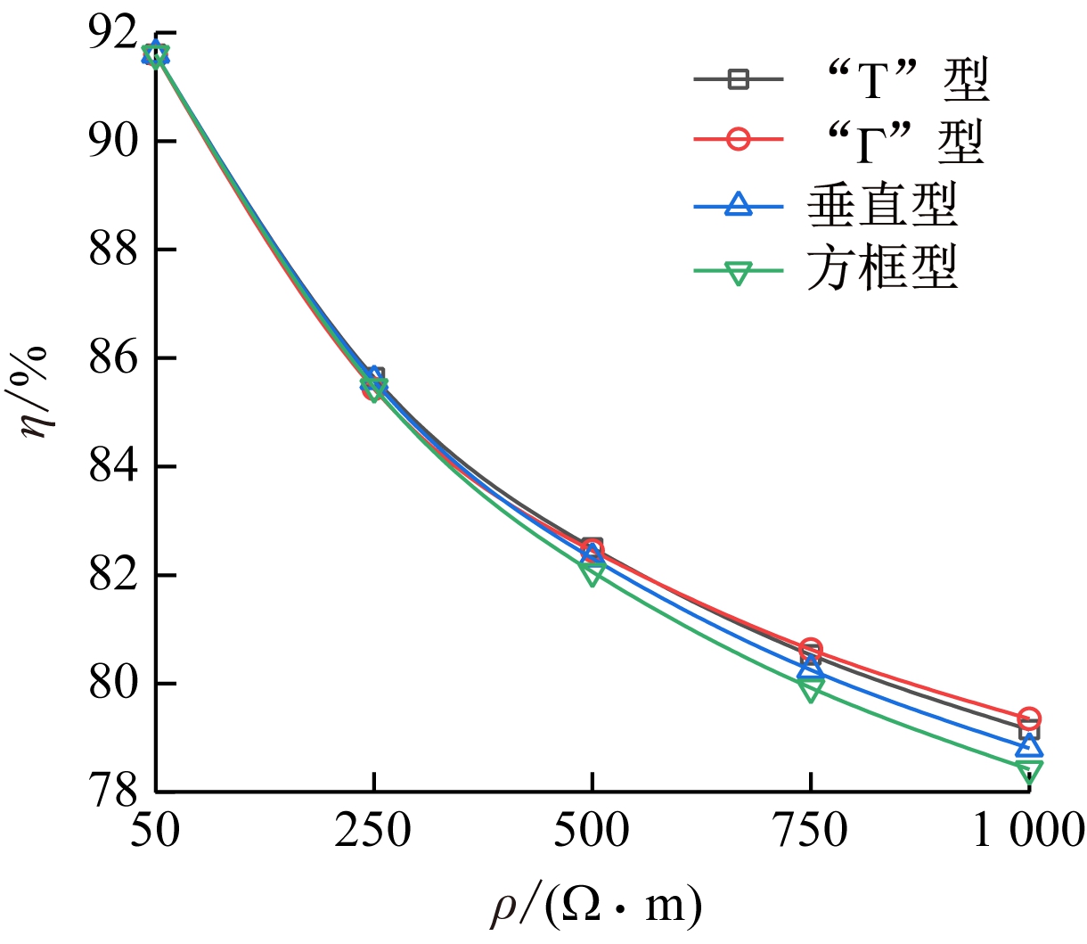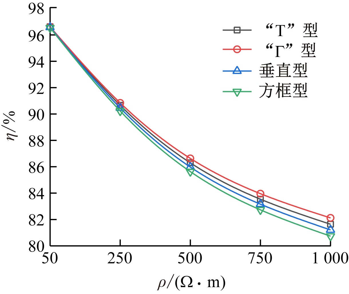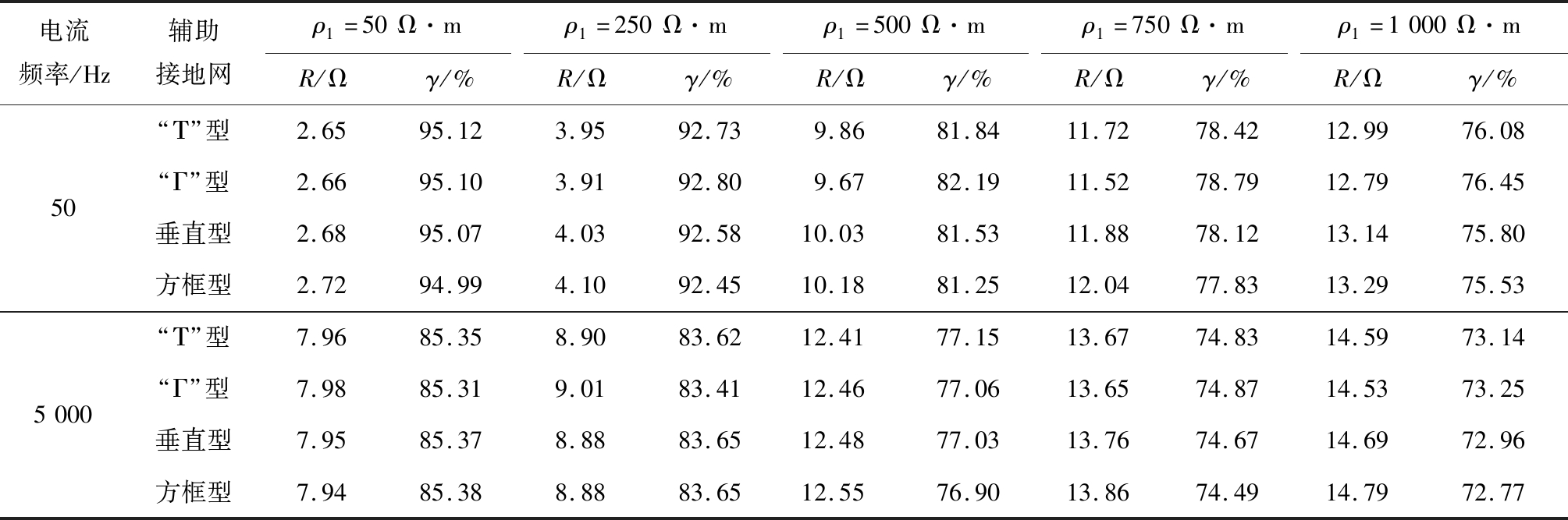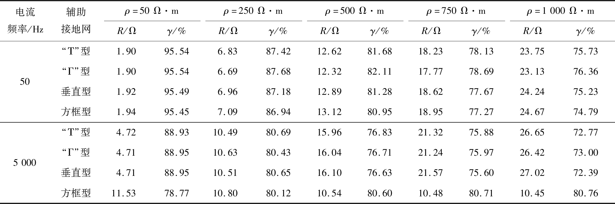 电流频率/Hz辅助接地网ρ=50Ω·mρ=250Ω·mρ=500Ω·mρ=750Ω·mρ=1000Ω·mR/Ωγ/%R/Ωγ/%R/Ωγ/%R/Ωγ/%R/Ωγ/%505000“Τ”型1.9095.546.8387.4212.6281.6818.2378.1323.7575.73“Γ”型1.9095.546.6987.6812.3282.1117.7778.6923.1376.36垂直型1.9295.496.9687.1812.8981.2818.6277.6724.2475.23方框型1.9495.457.0986.9413.1280.9518.9577.2724.6774.79“Τ”型4.7288.9310.4980.6915.9676.8321.3275.8826.6572.77“Γ”型4.7188.9510.6380.4316.0476.7121.2475.9726.4273.00垂直型4.7188.9510.5180.6516.1076.6321.5775.6027.0272.39方框型11.5378.7710.8080.1210.5480.6010.4880.7110.4580.76
