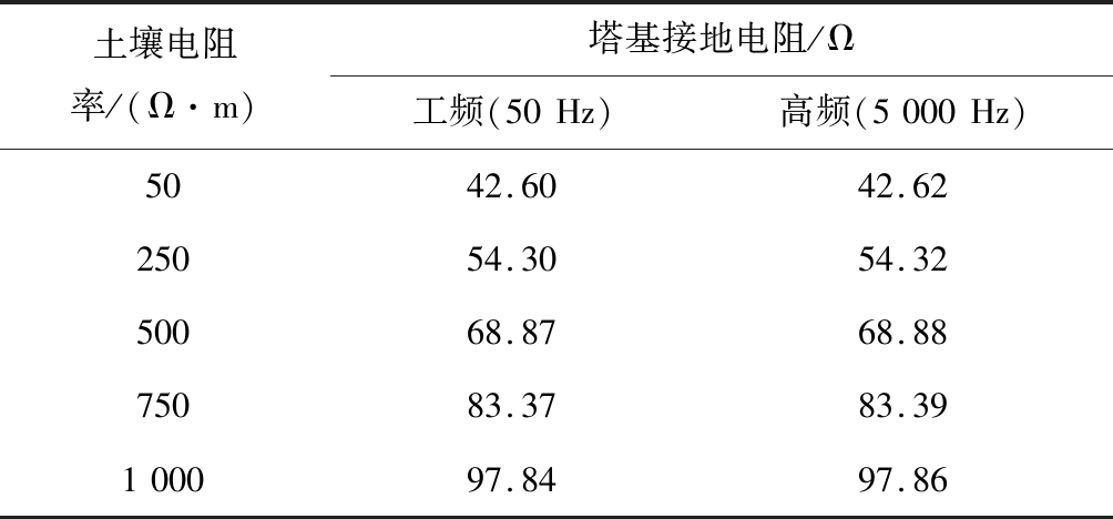 土壤电阻率/(Ω·m)塔基接地电阻/Ω工频(50Hz)高频(5000Hz)5042.6042.6225054.3054.3250068.8768.8875083.3783.39100097.8497.86