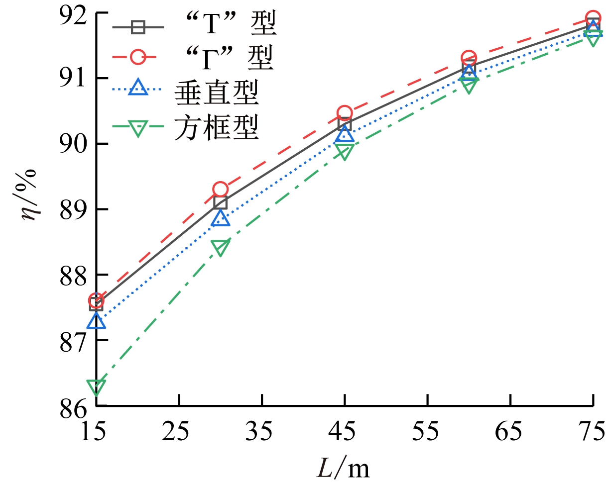 分流系数η用于表征外延辅助接地网对钢管塔混凝土桩基的分流能力。外延引线长度取不同值时的分流系数如图3所示。
