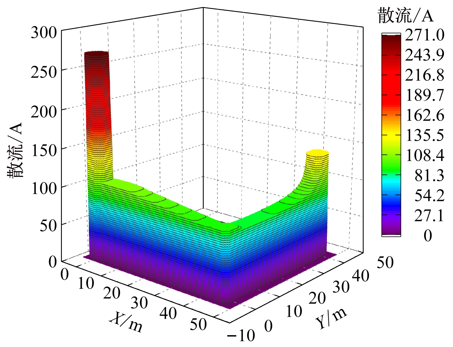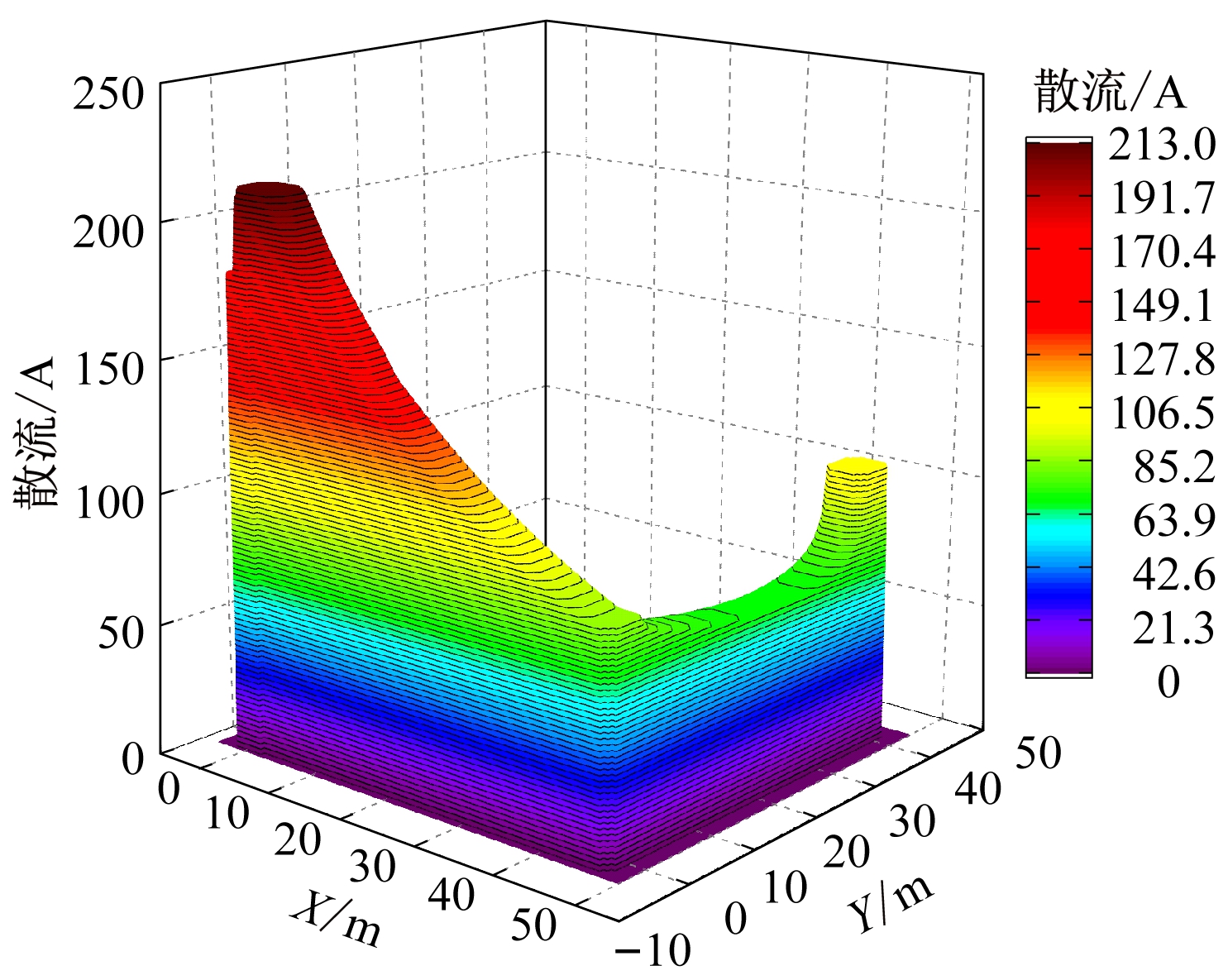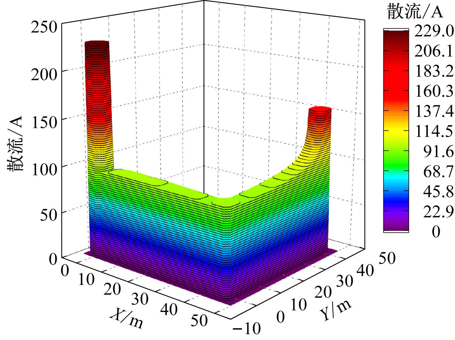 为了观察“Γ”型辅助接地网的散流过程,通过仿真计算得到外延引线长度为45 m时的散流分布情况,如图6所示,其中X为塔基直径加外延引线的铺设长度,Y为辅助接地网的铺设长度。