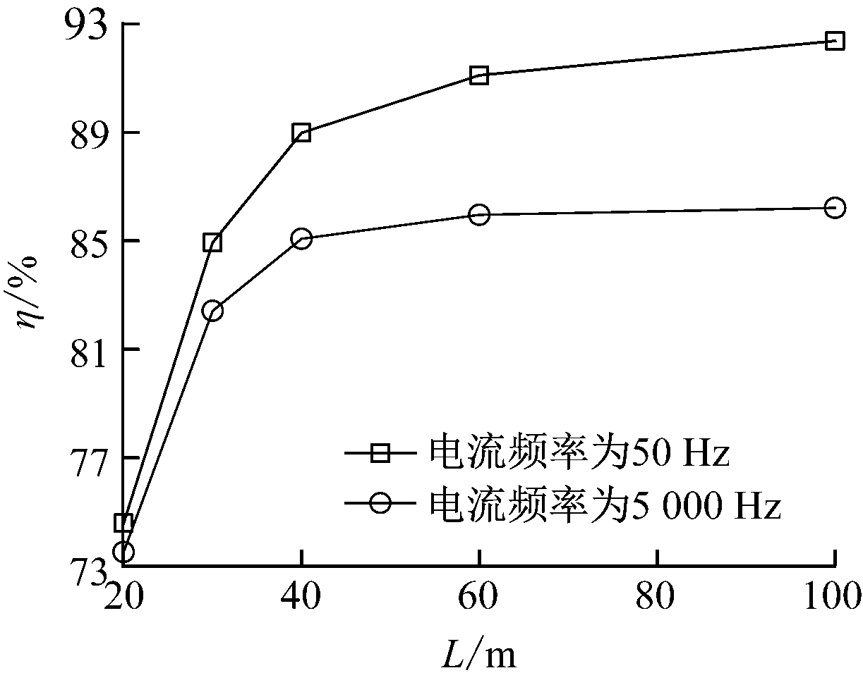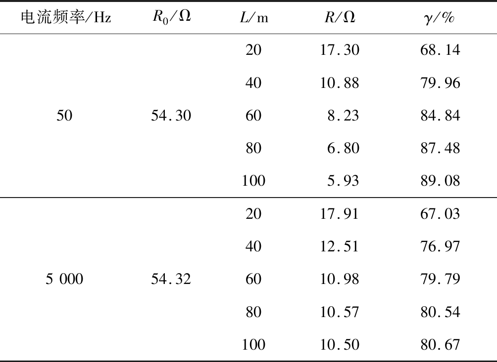 由表2可看出,在工频电流的作用下,随着外延引线长度增加,接地电阻逐渐减小,减小幅度也逐渐减小。随着外延引线长度增加,最大降阻效率达到89.08%。在高频电流作用下,当外延引线长度为60 m时,降阻效率可以达到79.79%,但是接地电阻减小的趋势逐渐减缓。这是由于外延引线具有一定的有效散流长度,超出有效散流长度后,降阻效果就不会明显提升。当外延引线长度大于60 m时,辅助接地网降阻效率增大的趋势减缓。在实际工程应用中,采用镀锌钢接地材料作为外延辅助接地网的外延引线时,其长度不宜过长,否则将造成材料与施工成本的浪费。