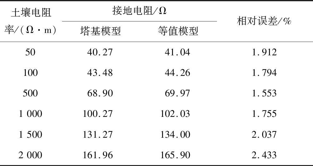 土壤电阻率/(Ω·m)接地电阻/Ω塔基模型等值模型相对误差/%5040.2741.041.91210043.4844.261.79450068.9069.971.5531000100.27102.031.7551500131.27134.002.0372000161.96165.902.433