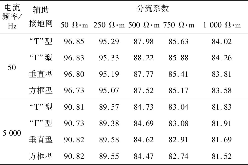 电流频率/Hz辅助接地网分流系数50Ω·m250Ω·m500Ω·m750Ω·m1000Ω·m“Τ”型96.8595.2987.9885.6384.02“Γ”型96.8395.3388.2285.8884.2650垂直型96.8095.1987.7785.4183.81方框型96.7395.0787.5285.1783.58“Τ”型90.8189.5784.7383.0481.83“Γ”型90.7389.3884.6983.0881.915000垂直型90.8289.5884.6282.9181.69方框型90.8289.5584.4782.7481.52