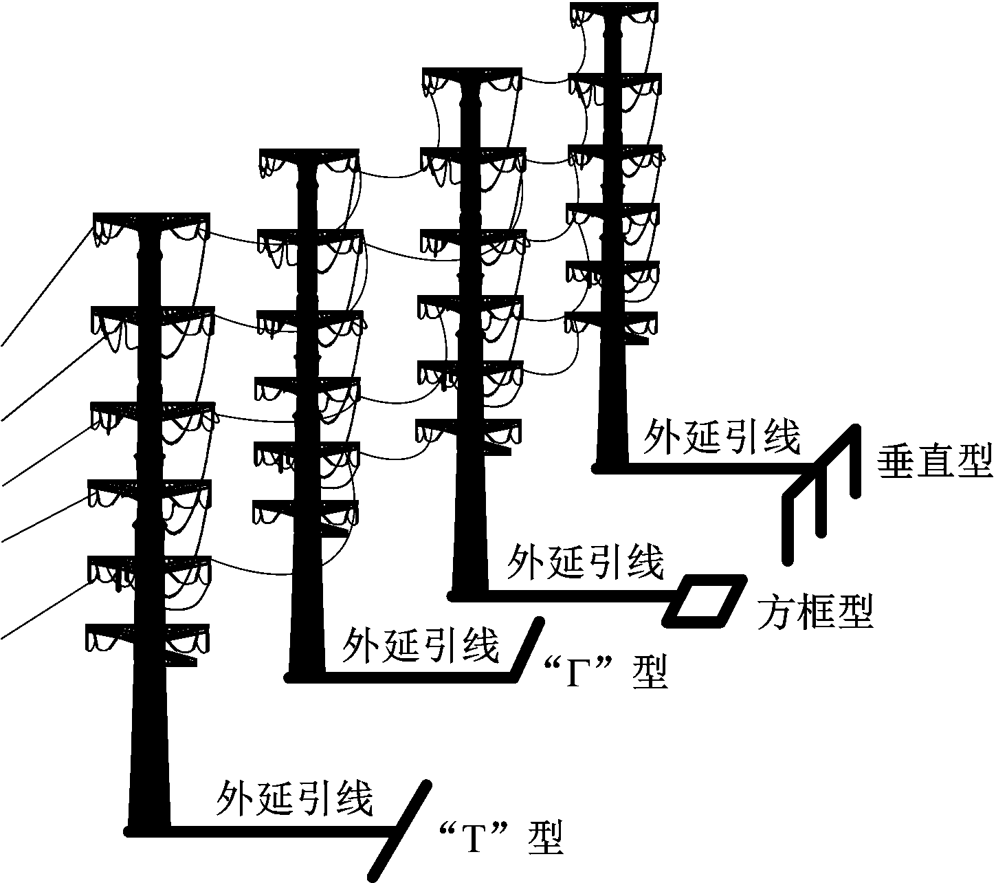 降低进线段杆塔的接地电阻,能够有效提高其反击耐雷水平,从而降低进线端绕击事故概率。通过铺设辅助接地网和外延引线,可降低钢管塔的接地电阻,达到散流的目的。针对矿区变电站进线段钢管塔,建立“Τ”型、“Γ”型、方框型、垂直型单向辅助接地网,杆塔与辅助接地网之间由外延引线连接,如图1所示。外延引线的作用是将入地电流更多地散流至终端,以降低杆塔接地电阻。